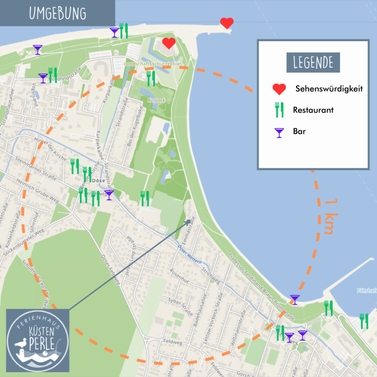 Die Unterkunft liegt im Kurteil Döse, nur 150 Meter vom Seedeich der Grimmershörnbucht entfernt. Der nahegelegene Seedeich mit Strandkörben lädt zum Entspannen ein. In unserer liebevoll eingerichteten Unterkunft erwarten Sie vier gemütliche Appartements, die alle Privatsphäre und Komfort bieten. Egal, ob Sie alleine reisen, als Paar oder mit Familie, Freunden und sogar Ihrem geliebten Vierbeiner – hier finden Sie das passende Zuhause für Ihren Urlaub an der Nordseeküste. Jedes unserer Appartements ist individuell gestaltet und verfügt über eine voll ausgestattete Küche, ein Bad und komfortable Schlafmöglichkeiten. Unser Ferienhaus liegt in unmittelbarer Nähe zum Deich, perfekt für ausgedehnte Spaziergänge entlang der Grimmershörnbucht. Die berühmte Sehenswürdigkeit, die Kugelbake, ist ebenfalls nur einen Steinwurf entfernt. Erkunden Sie die Umgebung und lassen Sie sich vom Nordseewind um die Nase wehen. Erleben Sie unvergessliche Tage in der "Küstenperle" und entdecken Sie die Schönheit der Nordseeküste in Cuxhaven-Döse.